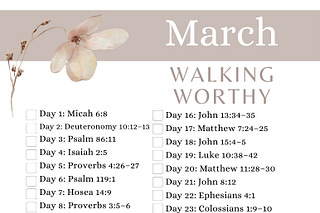 A March Scripture writing plan focused on walking worthy. Read, write, and reflect on one passage each day as you grow in obedience, faithfulness, and…
